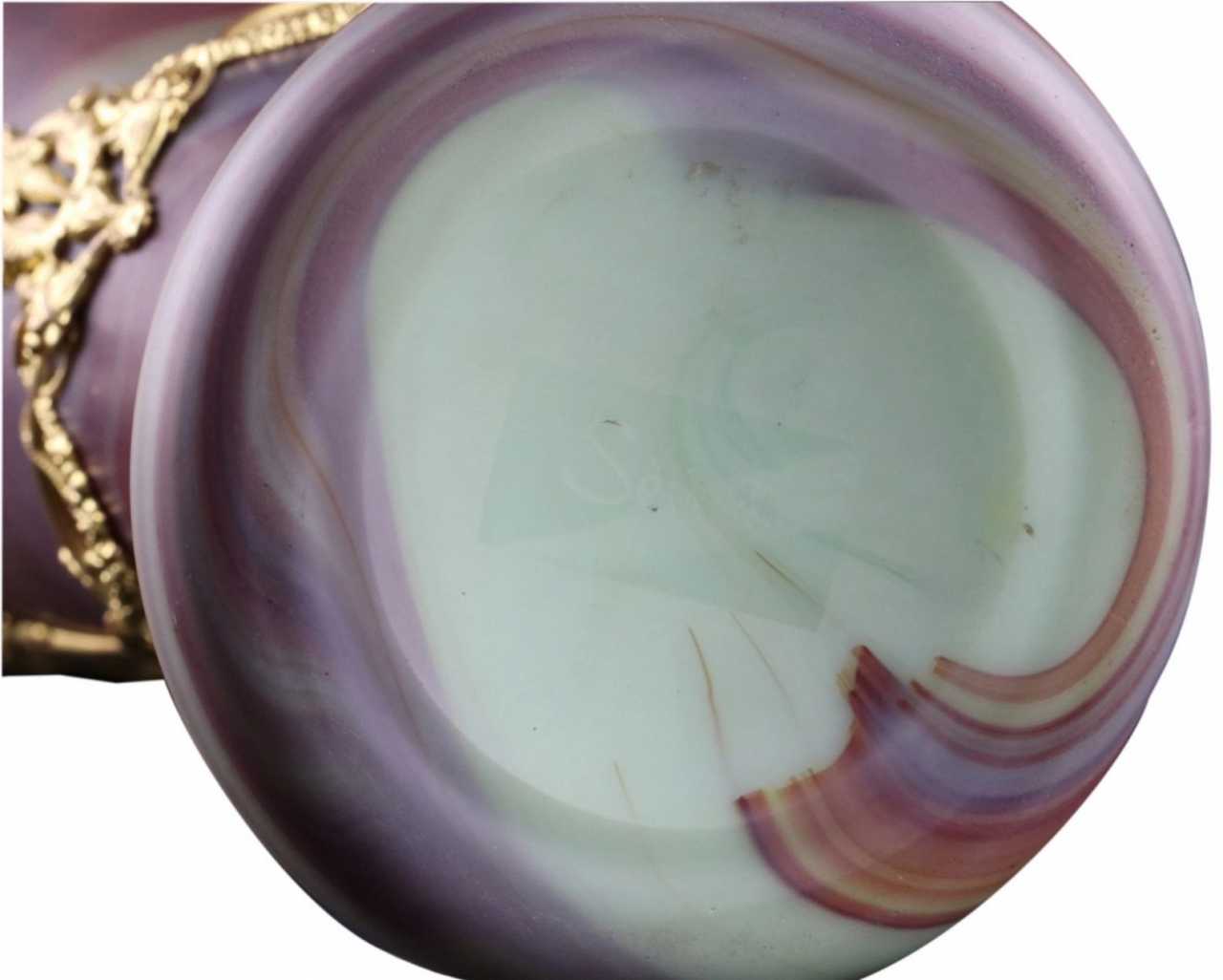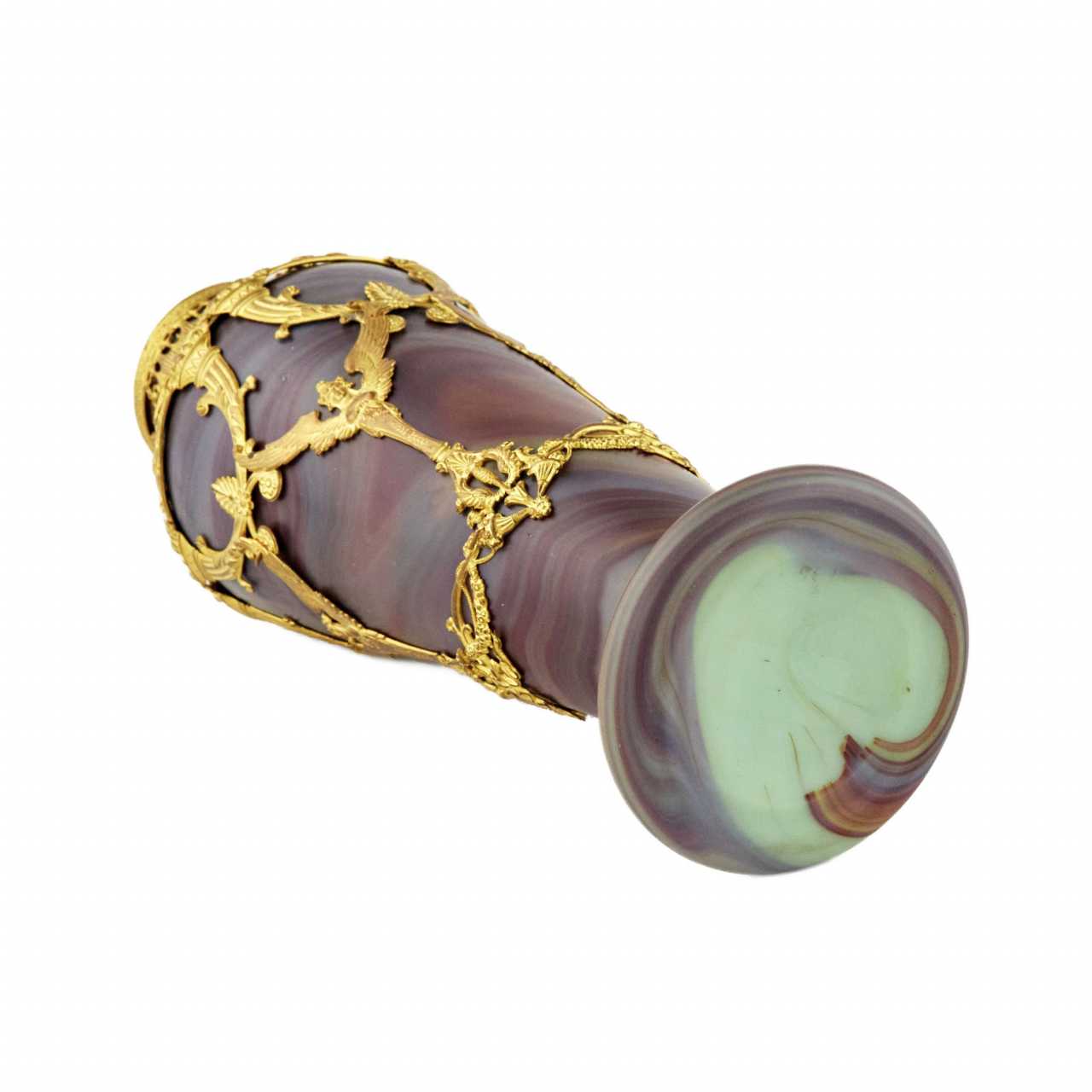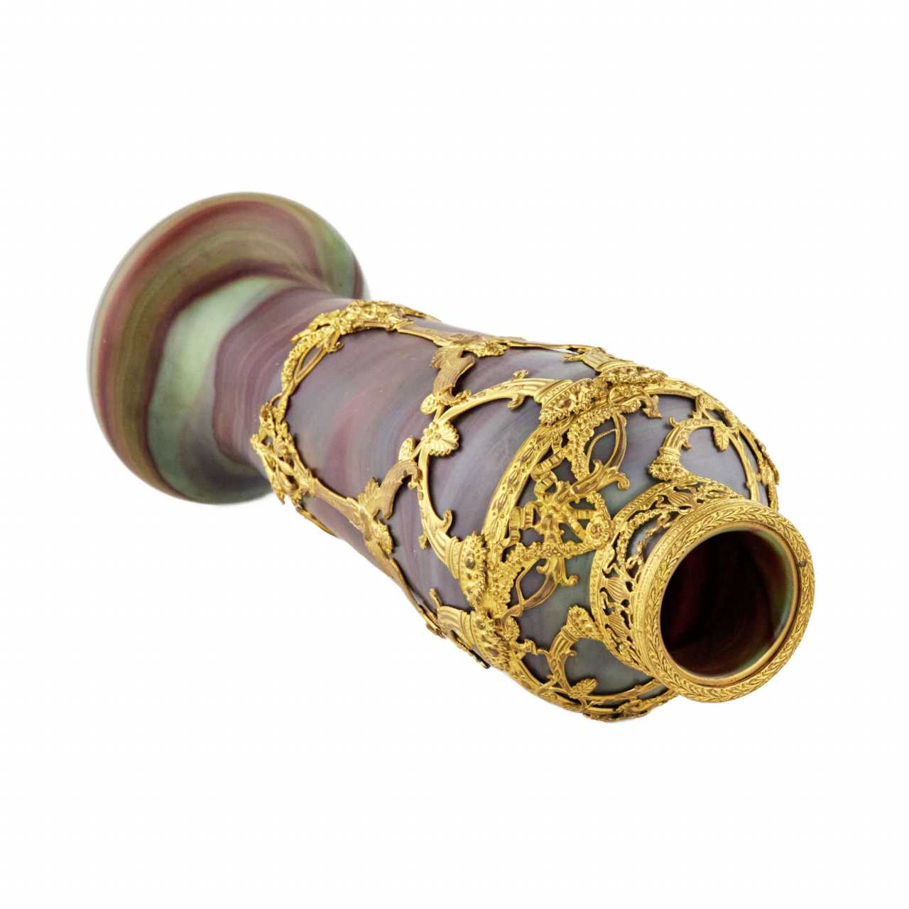 Un vase unique en verre d`agate et decore de ferrures dorees. Les superpositions decoratives epousent le corps moderne du vase avec un motif de vagues. Leur arsenal de cuivres regorge de grotesques neoclassiques. Marque : Sèvres.