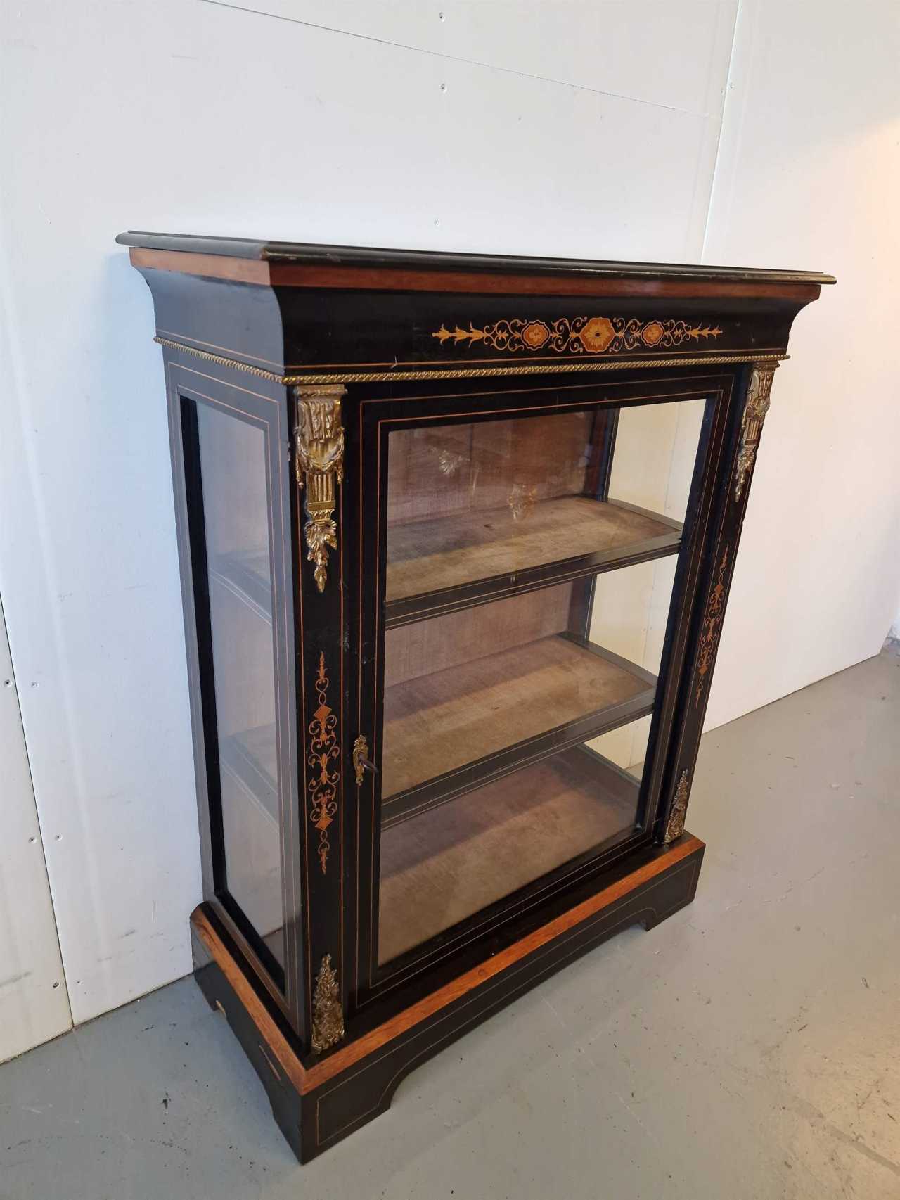 Vitrine ancienne. Acajou, bronze doré, belles marqueteries. France. Années 1850. Dimensions : hauteur 108 cm ; largeur 82 cm ; profondeur 36 cm.
