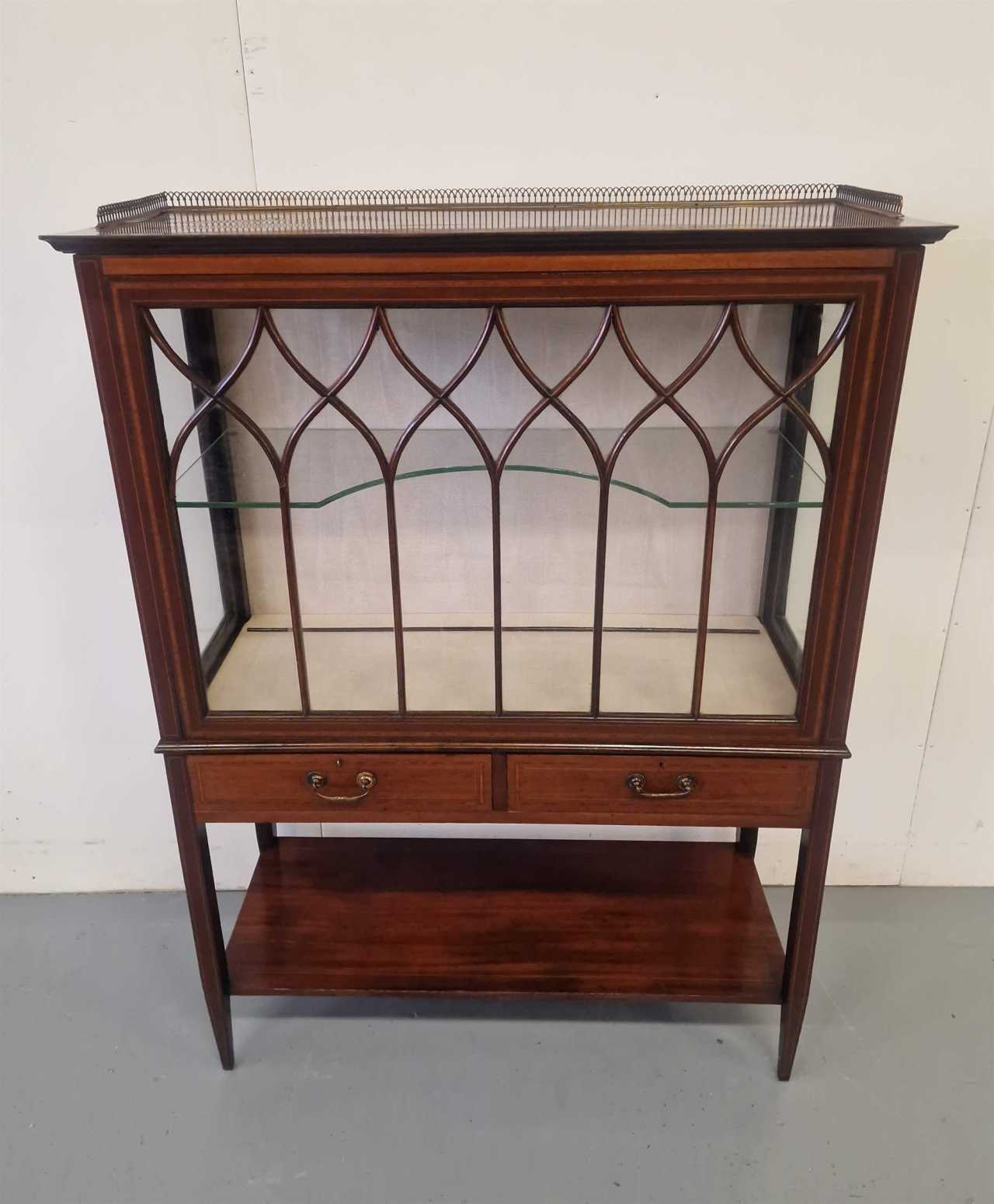 Vitrine élégante. Fabriquée en Angleterre dans les années 1870. Détails en acajou massif, incrustations, laiton. Dimensions : Hauteur 140 cm ; largeur 120 cm ; profondeur 40 cm.