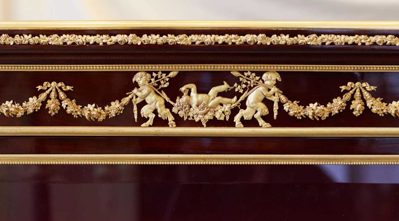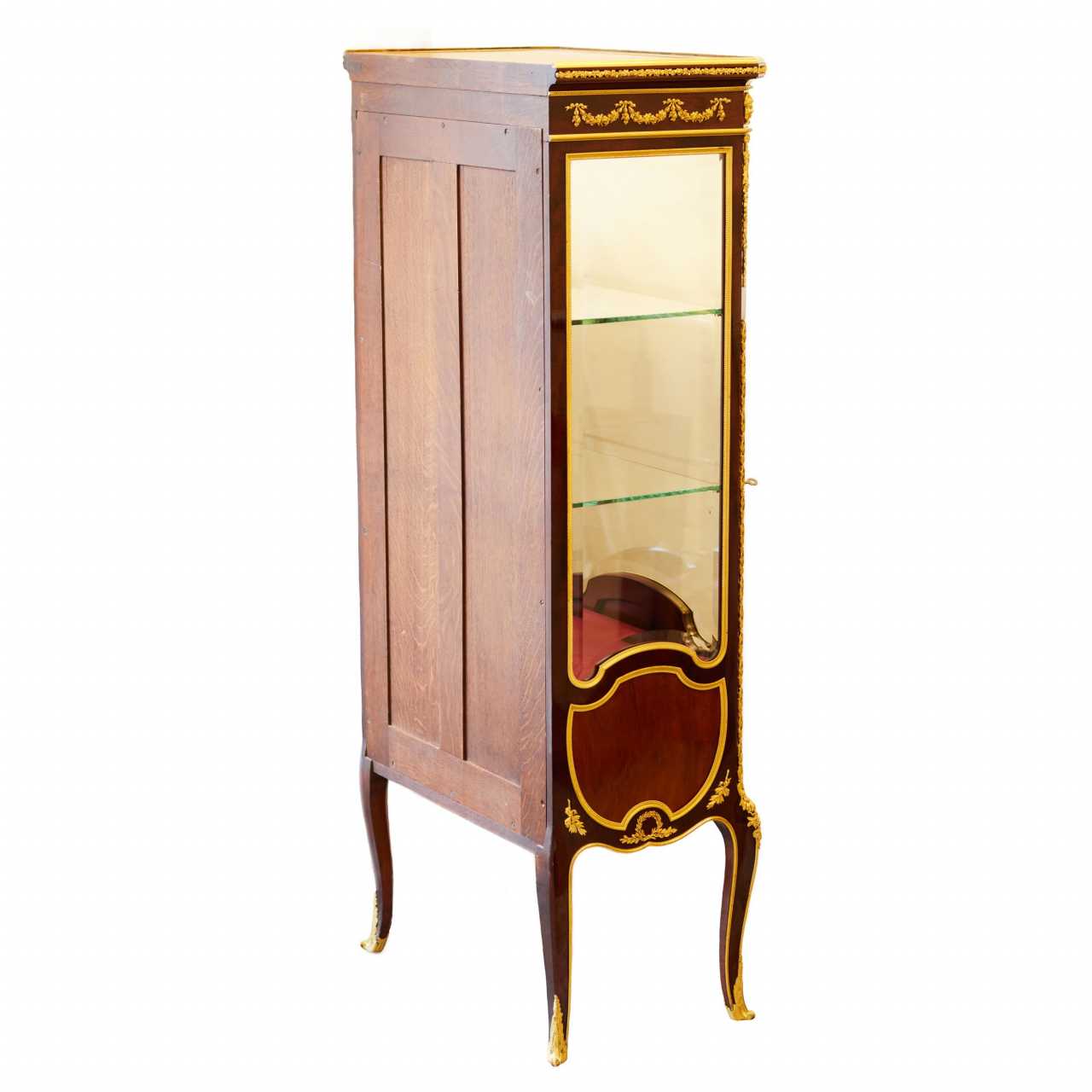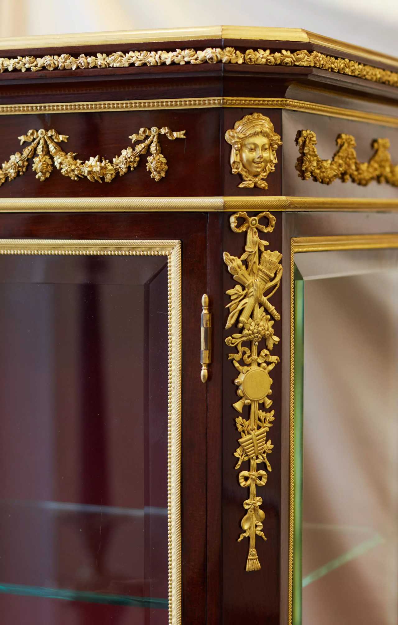 Une magnifique vitrine de style Sormani, aux proportions délicieusement fines et à la décoration gracieuse. Il sagit dune vitrine clé en main à un vantail en acajou sur pieds cambrés, à décor de bronze doré. Le rectangle allongé du corps aux coins biseautés est décoré de guirlandes ludiques dune frise de jeunes satyres portant leur compagnon de jeu, de grotesques musicaux et ligature de couronnes de laurier sur les plans des biseaux, dun panneau central avec des guirlandes florales luxuriantes, dun arc et de cornemuses. , et les jolis visages de mascarons dans les nœuds de la composition. On remarquera particulièrement le graphisme délicat et la finition des ceintures florales et des panneaux en filigrane de perles, soulignant lélégance des silhouettes des panneaux et lensemble harmonieux du produit.Verre biseauté sur trois faces, intérieur avec deux étagères en verre, dessus de marbre rose veiné. Dimensions : 149 x 64,5 x 38,5 cm France, fin du XIXème siècle.