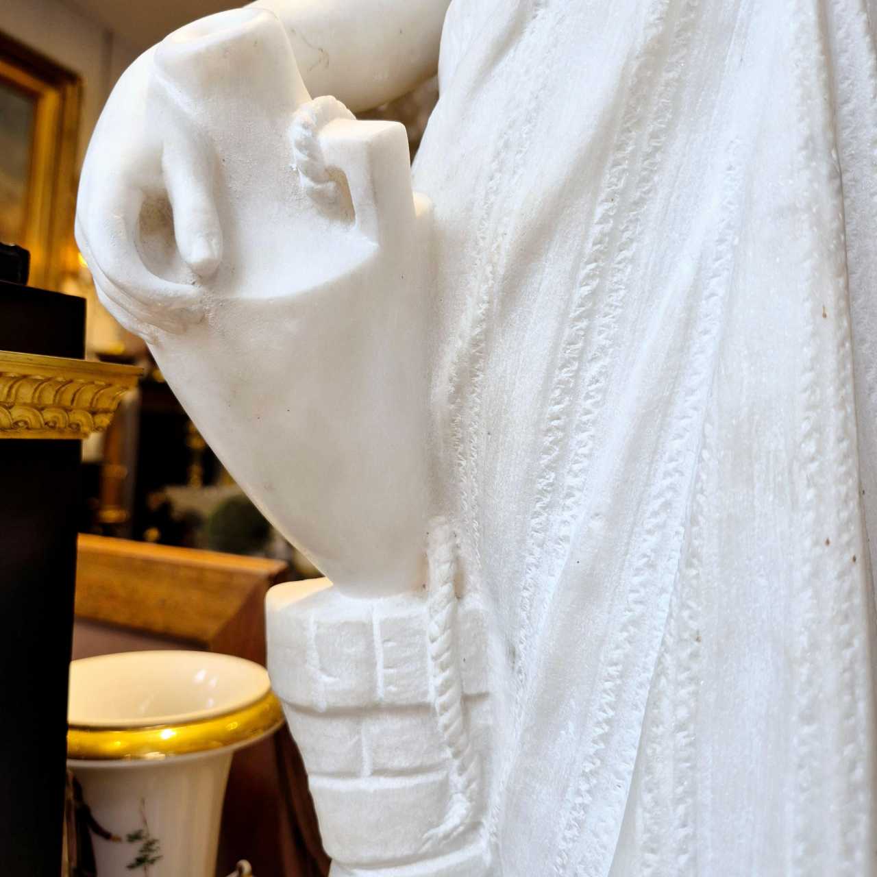 Charming sculpture of a young woman carrying a jug, signed by Bonnal on the back and inspired by “Rebecca at the Well” by 19th-century Italian School artist Guglielmo Pugi.The sculpture in fine white Carrara marble, created between the end of the 19ᵉ century and the beginning of the 20ᵉ century, depicts a pensive, lascivious young woman dressed in the fashion of the turn of the century: she wears a turban from which escapes curls of hair and a bracelet characteristic of the period; the cut of her dress is also very elaborate for a simple peasant woman. The finely embroidered motifs on the dress and turban are further evidence of the sculptors mastery.A delicate, feminine piece that will look great in a hallway or on a dressing table, and will make a lovely gift for an aesthete woman.Guglielmo Pugi lived in Florence, where he ran a sculpture workshop with his two sons. Their workshop, “Guglielmo Pugi e Figli”, was mainly dedicated to exports, particularly to the United States. Guglielmo Pugis work, emblematic of the Art Nouveau style, is characterized by direct carving in alabaster and Carrara marble (often white or veined).Some of his sculptures are now housed in Volterras Historical Alabaster Museum. Many of his works were shown at major international exhibitions, such as the 1901 Pan-American Exposition in Buffalo and the 1904 Exposition Universelle in Saint-Louis.