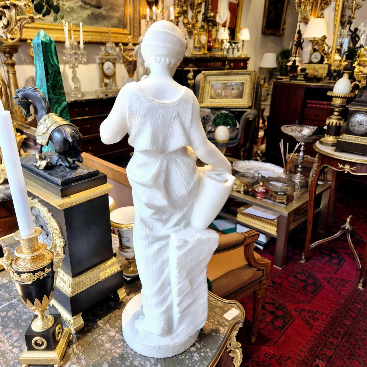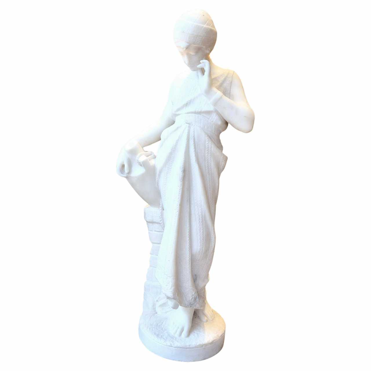 Charming sculpture of a young woman carrying a jug, signed by Bonnal on the back and inspired by “Rebecca at the Well” by 19th-century Italian School artist Guglielmo Pugi.The sculpture in fine white Carrara marble, created between the end of the 19ᵉ century and the beginning of the 20ᵉ century, depicts a pensive, lascivious young woman dressed in the fashion of the turn of the century: she wears a turban from which escapes curls of hair and a bracelet characteristic of the period; the cut of her dress is also very elaborate for a simple peasant woman. The finely embroidered motifs on the dress and turban are further evidence of the sculptors mastery.A delicate, feminine piece that will look great in a hallway or on a dressing table, and will make a lovely gift for an aesthete woman.Guglielmo Pugi lived in Florence, where he ran a sculpture workshop with his two sons. Their workshop, “Guglielmo Pugi e Figli”, was mainly dedicated to exports, particularly to the United States. Guglielmo Pugis work, emblematic of the Art Nouveau style, is characterized by direct carving in alabaster and Carrara marble (often white or veined).Some of his sculptures are now housed in Volterras Historical Alabaster Museum. Many of his works were shown at major international exhibitions, such as the 1901 Pan-American Exposition in Buffalo and the 1904 Exposition Universelle in Saint-Louis.