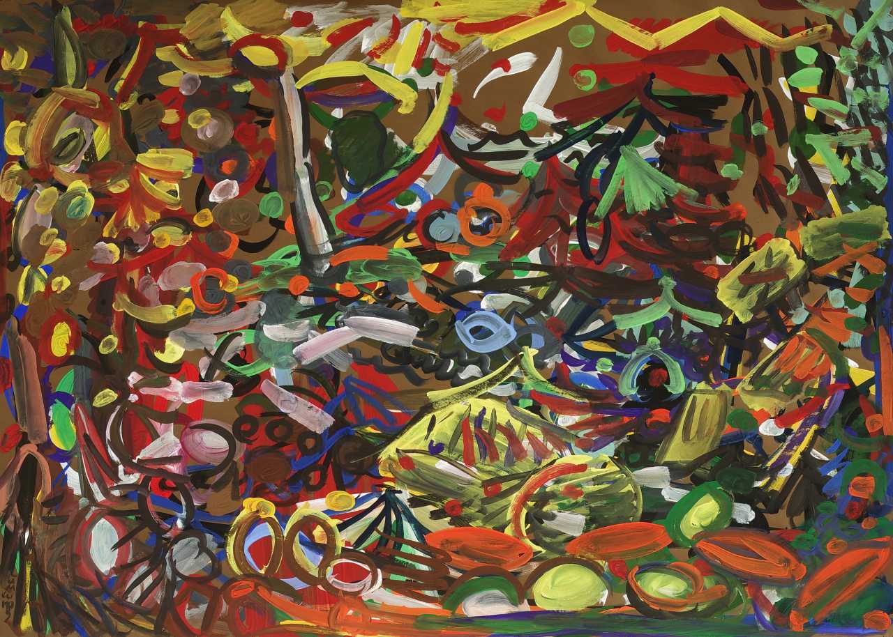 Работа исполнена в стиле Абстрактного экспрессионизма, на цветной бумаге, гуашью.