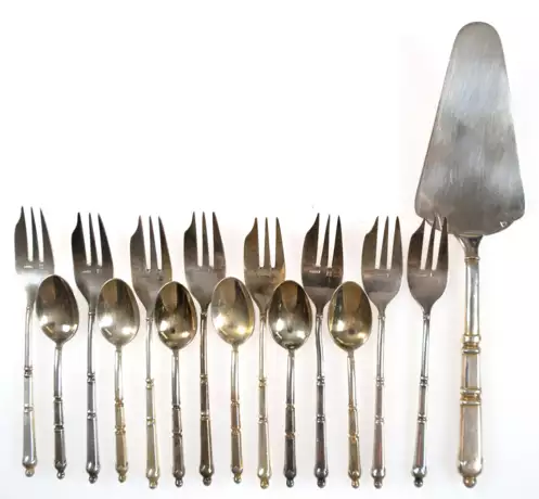 Lot 691 | 15 Besteckteile, Chambly, Frankreich, versilbert, bestehend aus 8 Kuchengabeln, 6 Kaffeelöffeln und 1 Tortenheber