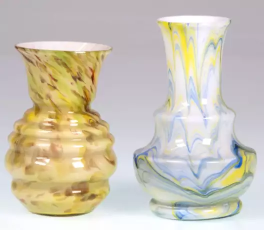 Lot 635 | 2 Art-Deco-Glasvasen, weißer Innenfang, farbige Einschmelzungen, H. 12,5 cm und 14 cm