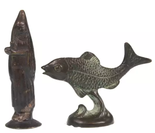 2 Bronze-Gluttöter, um 1920, dabei Fisch H. 4 cm und Burgfrau H. 6 cm