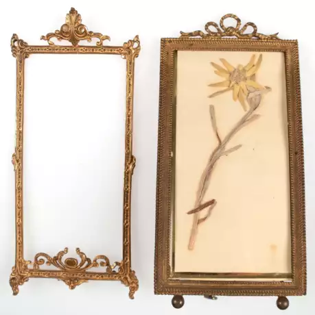 Lot 634 | 2 diverse kleine Rahmen, Messing, davon 1 Standfotorahmen mit Schleifenbekrönung, und Glas, Innenmaß 20x10 cm und Rahmen mit ornamentalen Verzierungen, Innenmaß 20x9,5 cm