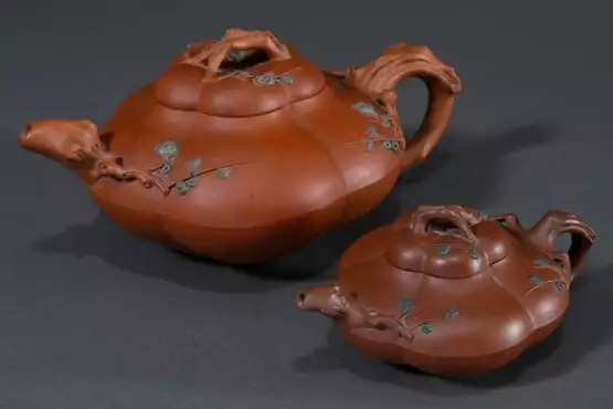 Lot 1319 | 2 Diverse Zisha Teekannen aus Yixing Steinzeug in fünfpassiger Kürbisform mit Astgriffen und eingefärbten Applikationen "Pflaumenblüten", im großen Deckel gestempelt, H. 6,5/10,5cm, 1 Deckel bestoßen