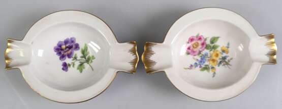 Lot 442 | 2 Meissen-Aschenbecher mit 2 Ablagen, Bunte Blume 1 und 3, mit Goldstaffage, 2. bzw. 1. Wahl, L. 14 cm