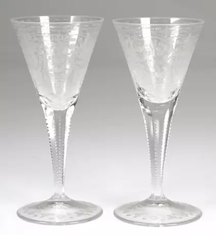 Lot 631 | 2 Sektkelche, Moser Maharani, ausgestellte Kuppa mit floralem Tiefschliff, Stand mit Facettenschliff, H. 20 cm