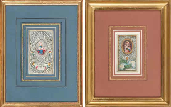 Süddeutsch, 18.Jh. Pergament geschnitten und gestichelt bzw. genadelt, partiell gouachiert. (1) Beidseitig ovale Gouacheminiaturen. Recto: Vesperbild von Mais (Südtirol). Schriftband "S. Maria zum Trost / in Maiss bitt für uns". Verso: Monstranz mit dem Hl. Blut von Stans (Tirol). Schriftband "O H: bluet zu Stanns / Steh uns beÿ". Umgeben von feinstem Spiralranken-, und Ästchenschnitt. 9x4,5 cm (Schnitt). Gerahmt. (2) Vierpass-Medaillon mit Miniatur des Hl. Heinrich als römisch-deutscher Kaiser mit Kirchenmodell. Schriftband "S. Hene(?)ricus". Feiner Ästchen- und Netzmaschenschnitt mit Blumen. 10,5x6 cm (Schnitt). Gerahmt.