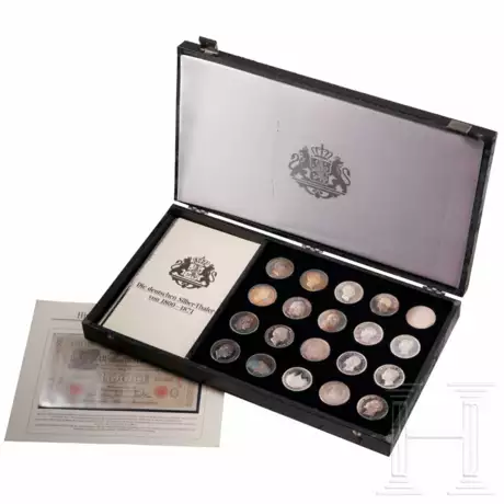 Durchmesser der Thaler je 3,5 cm, Gesamtgewicht 393,15 g. In Etui mit Samteinlage. Zu jedem Thaler eine Beschreibung beiliegend. Dazu die Besitzerurkunde mit Ausgabennr. (177 von 2.500). Etui mit starken Fehlstellen. Maße Etui 41 x 23 cm. Außerdem eine braune Tausender-Banknote des Deutschen Reichs vom 21. April 1910 mit siebenstelliger roter Nr., Maße 10,8 x 18,6 cm.