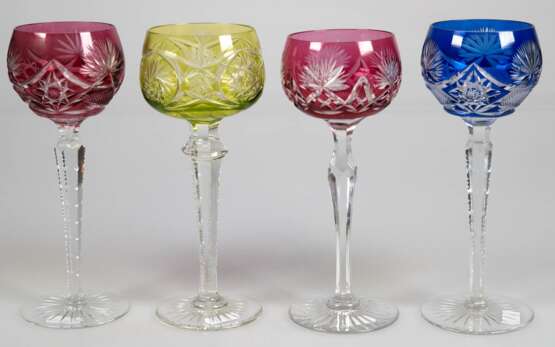 Lot 611 | 4 diverse Römer, Weingläser mit farbiger, reich geschliffener Kuppa, Stiele z.T. geschliffen, H. 19 cm - 21 cm