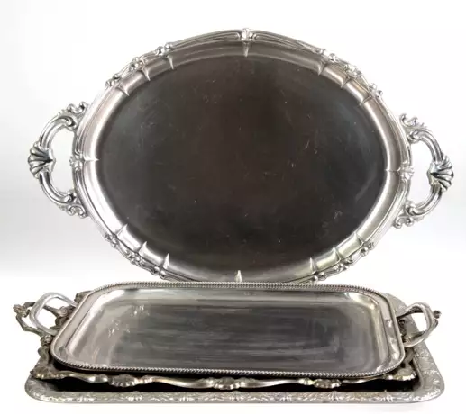 Lot 591 | 4 diverse Tabletts, Weißmetall, teils versilbert, 3x mit 3 seitl. Henkeln, L. 53 cm, 56 cm, 63 cm und 49x38 cm