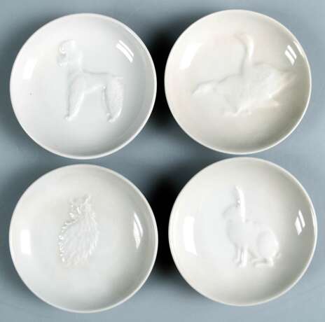 Lot 434 | 4 KPM-Tellerchen mit Tierrelief, weiß glasiert, blaue Zeptermarke, Dm. 8,5 cm