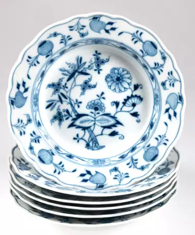 Lot 414 | 6 Meissen-Suppenteller, Zwiebelmuster, um 1900, Neuer Ausschnitt, Knaufschwerter mit 2 Schleifstrichen, Dm. 23,5 cm