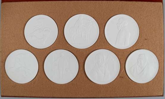 Lot 314 | 7 Meissen-Medaillen "Köpfe der Küste", von Jo Jastram, weißes Schaumporzellan, Herausgeber: Rat des Bezirkes Rostock, Dm. je 8 cm, im Originaletui
