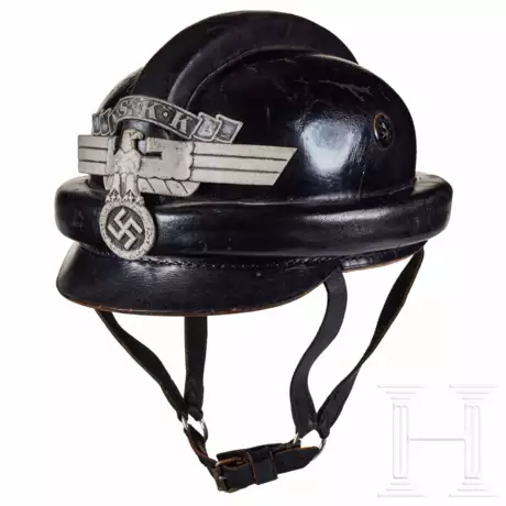 Vulcan fiber, black leather covered body, single ventilation on each side, black leather padded protective roll across top and around middle, black leather visor, silver finished metal eagle with NSKK banner attached to front. Black leather adjustment strap and metal buckle. Tan color leather liner with black ink stamp and handwriting, size stamp “57”. Exhibits age.