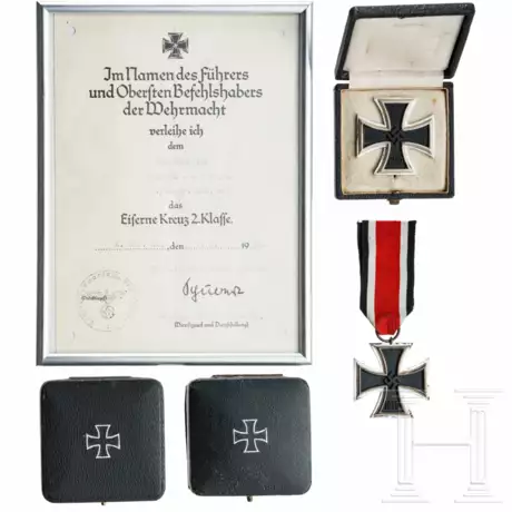 Eisernes Kreuz 1. Klasse 1939 im Etui, Hersteller "L/52" auf der Nadel, zwei Verleihungsetuis zum Eisernen Kreuz 1. Klasse 1939, Eisernes Kreuz 2. Klasse 1939 am Band mit Verleihungsurkunde, OU von General der Infanterie Albrecht Schubert. Alters- und Gebrauchsspuren.