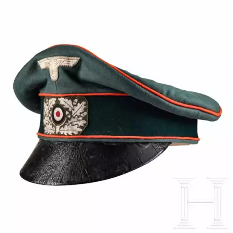Cap body in field-grey wool, green cap band, orange piping, machine-woven off-white eagle and silver-aluminum wreath, hand-applied. Black leather visor with smooth finish underside exhibits heavy age. Orange-brown artificial silk lining with heavy age and small areas of damage. Light-brown leather sweatband. Light wear to insignia. Size ca. 57cm.