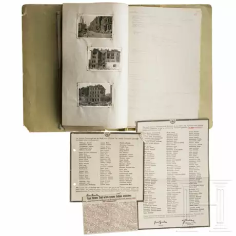 Mappe mit Schulungsunterlagen, ein Vortrag von Dr. Ziegenspeck, handschriftliche Aufzeichnungen und Skizzen sowie drei Fotos von zerbombten Gebäuden (wohl München). Desweiteren Zeitungsausschnitte und zwei Listen, welche die Todesopfer der Bombardierung von München am 03.10.1943 zeigen. Umfang ca. 45 Seiten, Alters- und Gebrauchsspuren. Die Hauptaufgaben des Sprengkommandos waren die Beseitigung von Blindgängern und das Beseitigen von Trümmern nach Luftangriffen. Selten zu finden!