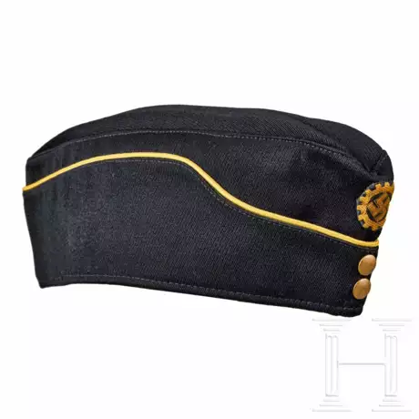 Cap body of black tricot wool, boat-shaped, yellow piping, two gilt finish pebbled buttons, machine-woven golden-yellow cog wheel and swastika on black backing, hand-applied. Black cotton lining, Size ca. 59.