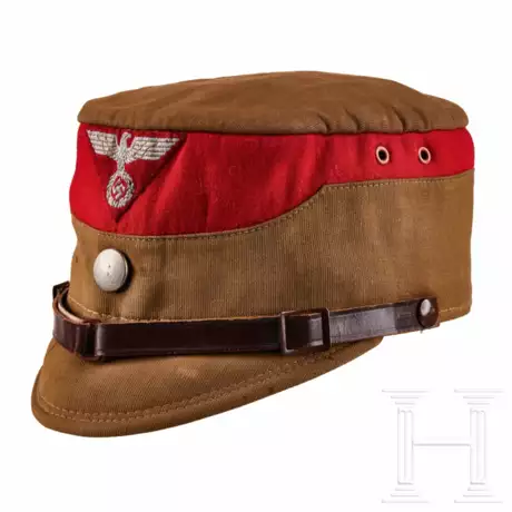 Olive-brown twill body and visor, rose red woolen band, four pink painted ventilation grommets, brown leather chin strap with metal buckles attached with two brown, smooth finish buttons. Silver-aluminum machine-woven eagle on red backing and silver finish pebbled button. Brown cloth lining, stamped manufacturer mark, brown leather sweatband. Minor moth nips. Exhibits age. Size ca. 54.