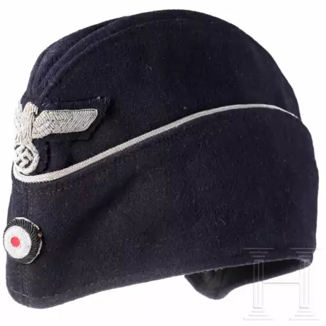 Feines dunkelblaues Tuch mit umlaufender Silberpaspelierung, komplett mit aus Metallfaden handgesticktem Hoheitsadler und Kokarde, handvernäht, schwarzes Innenfutter, keine Mottenschäden.