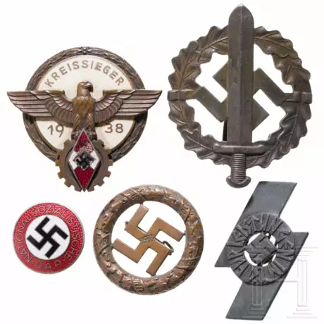 Abzeichen für Kreissieger im Reichsberufswettkampf 1938, die Raute sichtlich gechipt, die rs. Herstellerbezeichnung grob entfernt. Ein Parteiabzeichen, eine DJ-Leistungsrune (B-Stück, M 1/15), ein Traditionsabzeichen München/Oberbayern (Broschierung nachverlötet) und ein SA-Sportabzeichen in Bronze.