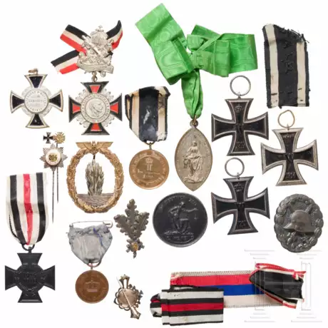 Ca. 35 Auszeichnungen/Abzeichen. Ein Minensucher-Kriegsabzeichen (Buntmetall, Nadelsystem nachgelötet), zwei EK 2 von 1914 und andere Auszeichnungen/Abzeichen, überwiegend Kriegerbund vor 1914. Außerdem Feldspangen, Rangsterne, Knöpfe u.a. Teils beschädigt/unvollständig.