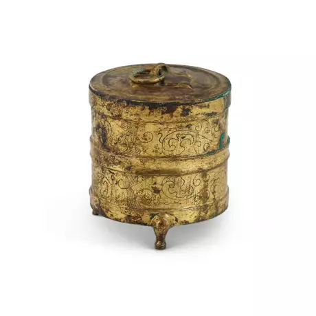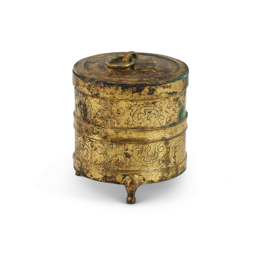 Lot 1227 | A SMALL INCISED GILT-BRONZE TRIPOD VESSEL AND COVER, LIAN
