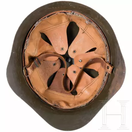 Einteilige Glocke mit aufgesetzter Belüftungsabdeckung im Scheitel, dunkelgrün lackiert. Späteres Lederfutter (russisch? Filzpolsterung fehlt) an federndem Innenring und Lederschweißband, im Nacken Schlagstempelung von 1938 (?). Teils flugrostig mit Klebespuren. Möglicherweise zivil bzw. von einem Satellitenstaat weiterverwendet.