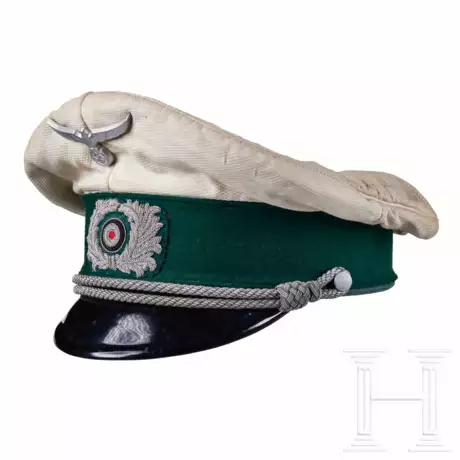 Removable cap body in white waffle-pattern cloth, green cap band, silver-aluminum chin cords attached by two silver finish pebbled buttons. Silver-finish metal eagle, silver-aluminum embroidered wreath and cockade. Black lacquered visor with tan, checkered underside. Cream-color imitation silk lining, moisture shield intact with manufacturer mark to Clemens Wagner, tan leather perforated sweatband. Minor moth nips. Exhibits age. Size ca. 56.