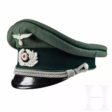 Cap body in field-grey wool, green cap band, dark green piping, silver-aluminum chin cords attached by two silver finished pebbled buttons. Silver-aluminum metal eagle and wreath, metal cockade with red cloth center. Black lacquered visor with brown, smooth finish underside. Cream color imitation silk lining, moisture shield intact, dark brown leather sweatband. Size ca. 57 cm.