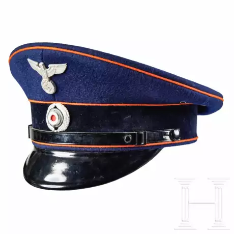 Cap body in blue wool, black velvet cap band, orange piping, black leather chinstrap with metal buckles, attached by two black smooth finish buttons. Silver finish metal eagle, metal wreath and cockade with red cloth insert. Black lacquered visor with brown, checkered finish underside. Orange cloth lining, moisture shield intact, manufacturer mark “C. Louis Weber Hannover” and size stamp “56 ½”. Brown leather sweatband.