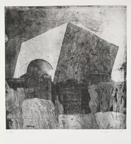 Krimmel 260-68. - 3. Druck der Tukanpresse. Eines v. 65 num. Ex. (GA 85) auf Rives-Bütten. Mit einer Einführung sowie hrsg. von W.Rothe. Druck der Radierungen bei W.Weiss, Berlin. - Schöne Folge zu Texten expressionistischer Großtadtlyrik, mit Graphiken zu 9 Gedichten von Georg Heym, Jakob von Hoddis, Alfred Lichtenstein, Johannes R. Becher, Georg Trakl und Alfred Wolfenstein. Die den Radierungen vorgelegten, mit den Gedichten bedruckten Folien fügen Text und Bild zu einem stimmigen Ganzen. Durch Abheben der Folie bleibt wahlweise die reine Bildbetrachtung. - Schwache Gebrauchssp.