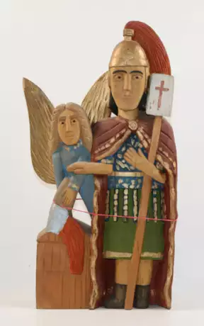 (1929 Zurowiec - 2007). Soldat und Engel. Holzskulptur, polychrom gefasst. Ca. 44 x 24 x 8 cm. Unt. sign.