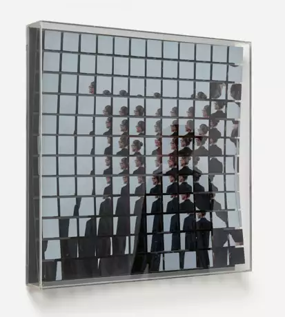 Technique: 144 square mirrors on a concave-curved plexiglass board, on a black-framed wooden rear panel. In a plexiglass box.