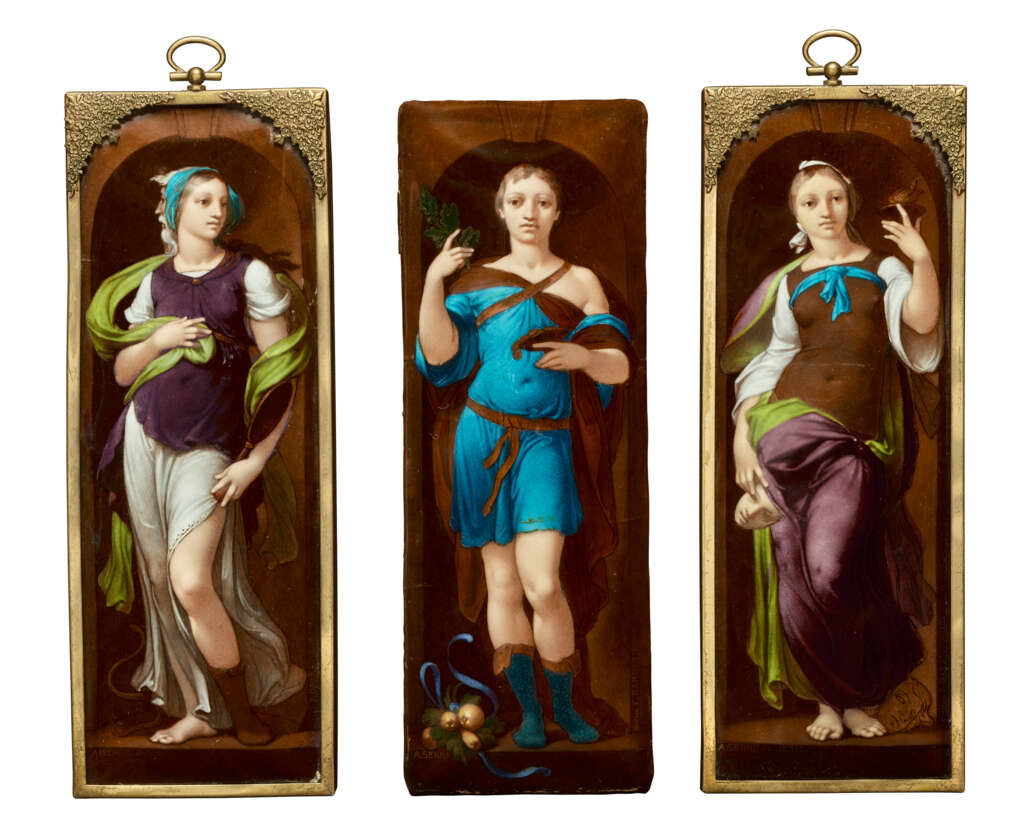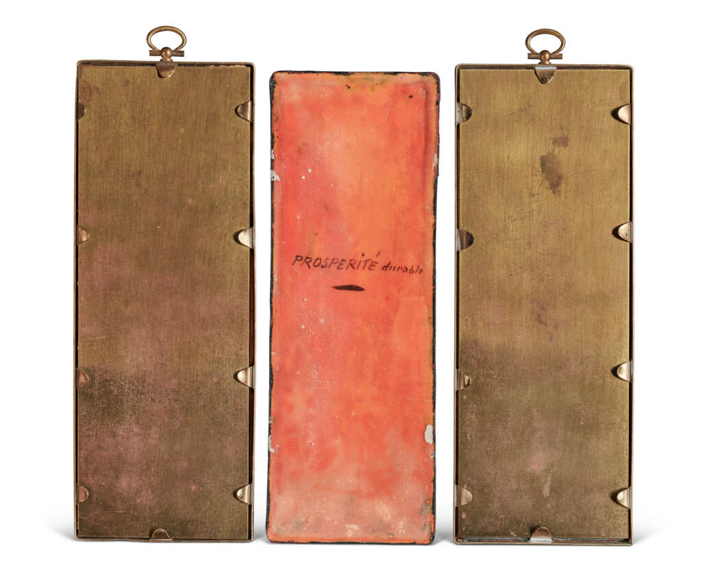 suite trois plaques rectangulaires en émail peint polychrome, rehauts d'or, signées et datées ‘A.SERRE.INV.1881’ et 'maison F.BARBEDIENNE.', titrées au revers 'PROSPERITÉ durable', 'PRUDENCE' et 'LOYAUTÉ', deux plaques dans des cadres en bronze doré