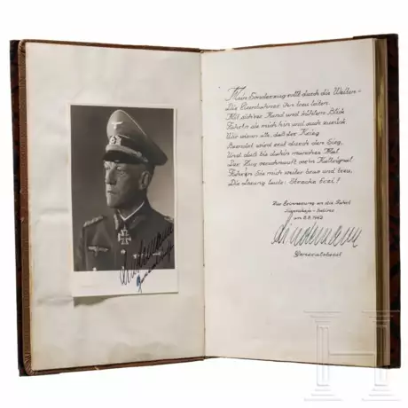 Zweifarbig brauner Kunstledereinband mit Goldprägung "Gäste-Buch" sowie Goldschnittseiten, ca 28 x 17,5 cm. Die erste Seite mit zwei Aufnahmen Lindemanns im Schützengraben (eines mit RK und EL), folgend drei Portraitfotos von Undeutsch, seiner Frau und dem 1943 im Lazarett Gattschina verstorbenen Triebwagenbeimannes Schubert. Doppelseite mit signierter Portraitpostkarte Lindemanns mit RK bzw. kalligraphischem Gedicht mit erneuter Signatur "Lindemann". In der Folge unzählige Unterschriften in Blei- oder Kopierstift von Generälen und ihren Stabsoffizieren, zumeist datiert, teils mit Bezeichnungen der Fahrtziele, teils mit Gedichten oder Anmerkungen. Unter den Autographen: bei nahezu jeder seiner Fahrten Gen.Oberst Georg Lindemann, Gen.d.Art. Albert Wodrig (mehrfach), Gen.d.Art. Emil Leeb, GFM Erich von Manstein (mehrfach), Gen.d.Art. Kurt Herzog (mehrfach), Gen.Major Erich Jaschke (mehrfach), Gen.d.Inf. Kuno-Hans von Both (mehrfach), Gen.d.Art Herbert Loch (mehrfach), Gen.Major Fritz Lindemann, GFM Georg von Küchler (mehrfach), Oberst Curt Siewert, Gen.d.Kav. Erik Hansen (mit persönlicher Widmung), Gen.Major Hans-Ludwig Speth (mehrfach), Gen.Lt. Rudolf Schmundt, vier japanische Offiziere mit Gen.Major Mitsuhiko Komatsu und Gen.Major Kiyotomi Okamoto, Gen.Major Friedrich von Schellwitz, Gen.d.Inf. Otto Wöhler (mit persönlicher Widmung am 14.8.43, dem Tag seiner RK-Verleihung), Gen.Major Siegfried Thomaschki, Otto Ziegenbein als "stellv. Landesleiter d. NSDAP Ostland" und viele mehr.