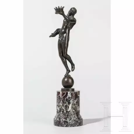 Schwerelos auf einer Kugel balancierende weibliche Allegorie mit Augenbinde, Märtyrerpalme und einer imposanten Krone in der gestreckten Linken. Vereinzelte Gussfehler. Auf stellenweise bestoßenem Sockel aus Stein (unbefestigt – Mutter fürs Gewinde fehlt). Auf der Sockelbasis zwei alte Etiketten auf Deutsch bzw. Französisch. Höhe m. S. 33 cm.