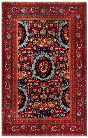 Persien. Wolle auf Baumwolle. Auf dunklem Fond flächendeckende Musterung aus roten Arabesken und hellblauen Blütengirlanden. Umlaufend breite, rotgrundige Palmettenbordüre. 205 cm x 136 cm.