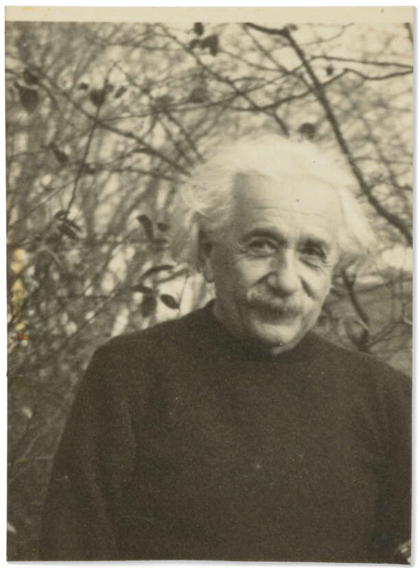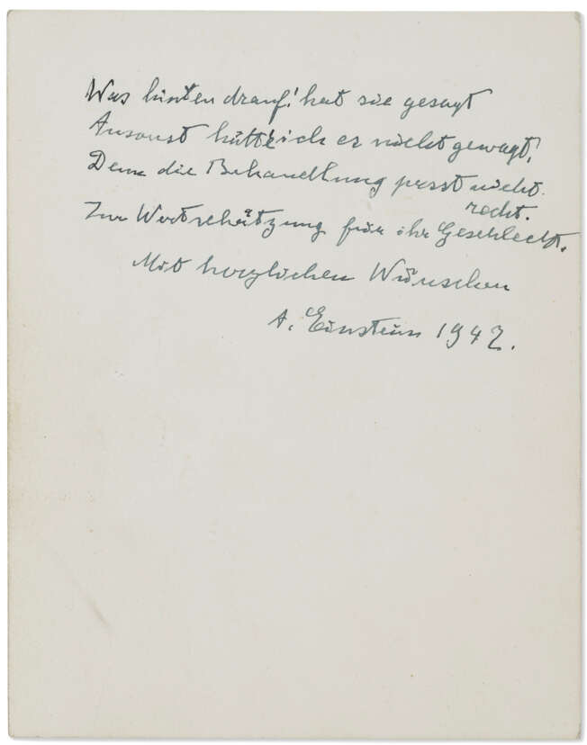– EINSTEIN, Albert. Photograph signed ("A. Einstein 1942) and inscribed with a poem on verso, [Princeton,] 1942. 143 x 114mm: ("Was hinten drauf! Hat se gesagt / Ausoust hütteich er nicht gewaagt / Dene die Buhandlung presst nicht / um Wert rehartzung from irh Gesehlicht.").