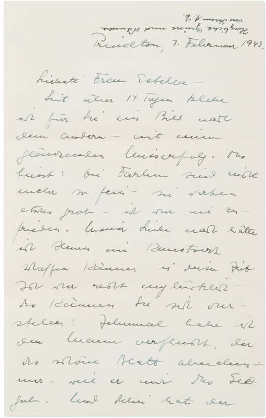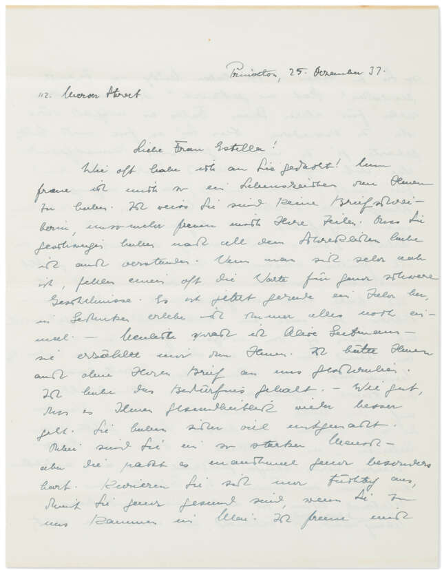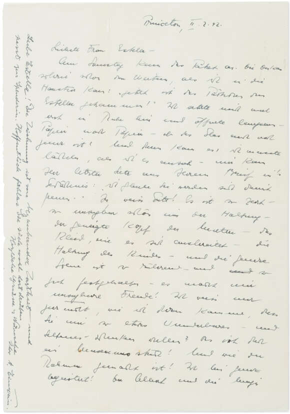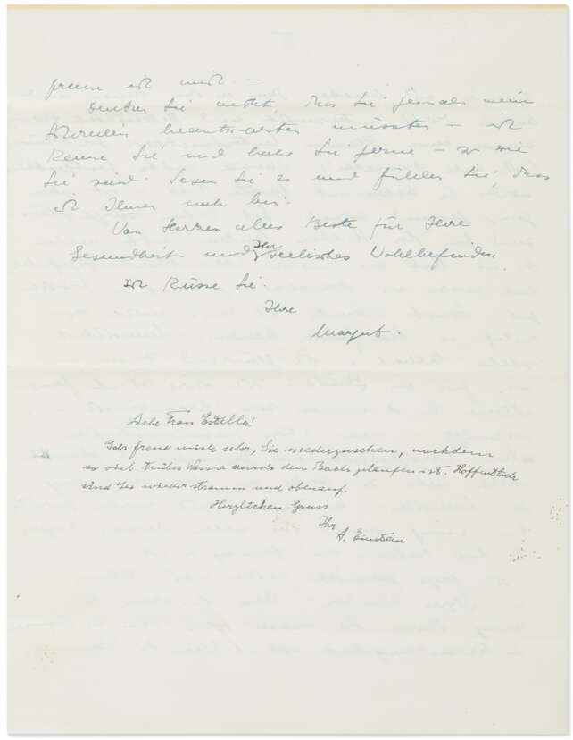 – EINSTEIN, Margot. Autograph letter signed to Estella Katzenellenbogen, Princeton, 7 February 1943. 2 pages, 203 x 126mm. [With:] EINSTEIN, Albert. Autograph note signed ("A.E.") at the top margin.