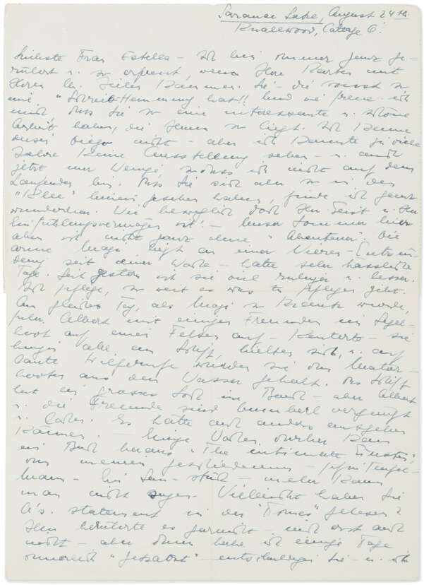 – EINSTEIN, Margot. Autograph letter signed to Estella Katzenellenbogen, Saranac Lake, 24 August [1944]. 2 pages, 247 x 180mm. Includes an amusing story of Einstein taking some friends out on a sailing boat and hitting a rock and being obliged to call for help. [With:] EINSTEIN, Albert. Autograph note (unsigned).