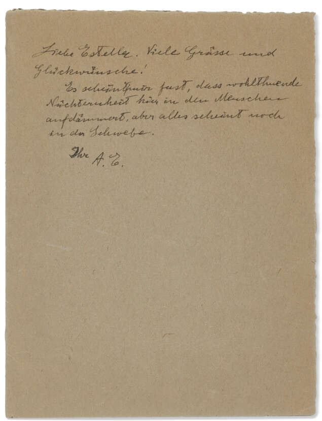 – EINSTEIN, Albert. Autograph note signed ("A.E.") to Estella [Katzenellenbogen, n.p., n.d. One page, bifolium card bearing a photograph of a sculpture, 160 x 120mm. He writes, "It almost seems to me that a pleasant sobriety is dawning in people here, but everything still seems to be up in the air."