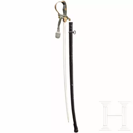 Vernickelte Stahlklinge mit Herstellermarkierung "Carl Eickhorn, Solingen" sowie "Militärwarenhaus Dürbeck, Wien" (Händler), leicht fleckig auf beiden Seiten, schwarzer Kunststoffgriff mit intakter Drahtwicklung, vergoldetes Aluminiumgefäß mit Eichenlaub-Ornamenten, auf dem Parierlappen der Hoheitsadler, schwarz nachlackierte Stahlscheide, anbei das Portepee. Länge Säbel 93 cm. Alters- und Gebrauchsspuren.