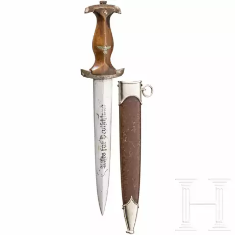 Die Klinge mit Devisenätzung, die Rückseite der Klinge stärker beschliffen, die Herstellermarkierung ist nicht mehr zu erkennen bzw. nur noch das "M" ist etwas zu sehen. Früher Holzgriff mit Adler und SA-Emblem, dieser leicht beschädigt, vernickelte Zinkbeschläge, die Scheide mit der orig. Lackierung und vernickelten Beschlägen (magnetisch), alle vier Schrauben vorhanden, der untere Beschlag an der Spitze beschädigt. Alters- und Gebrauchsspuren.