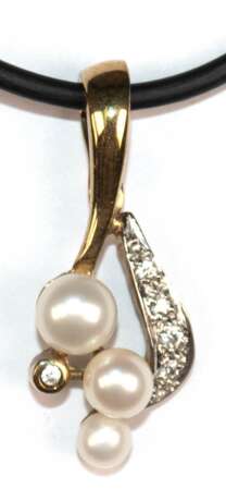 Lot 951 | Anhänger/ Clip, 333er GG, mit echten Perlen in 3 verschiedenen Größen und Zirkonia an schwarzem Kautschukband, Verschluss 333er GG, Länge ca. 46,0 cm, ca. 4,9 g