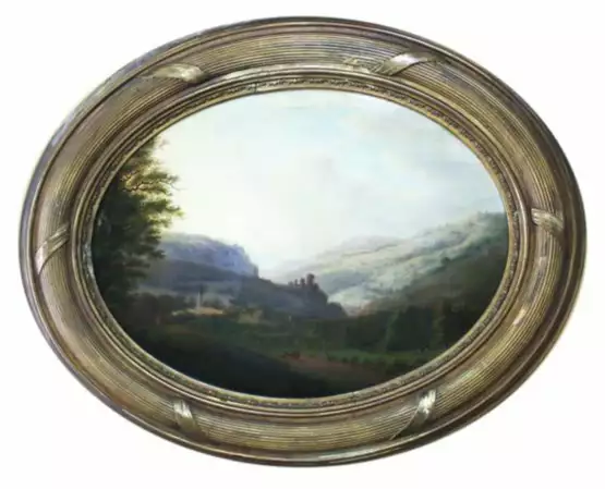Österreich Erste Hälfte 19. Jhdt. Landschaft bei Salzburg. Öl/Metall. 33,5 x 44,5 cm. (Oval).